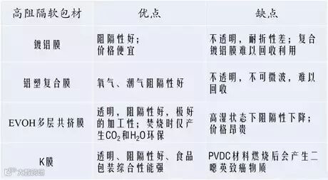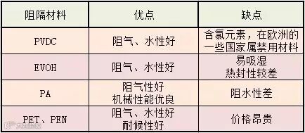 市场常规阻隔食品包装材料的优缺点如下表:
