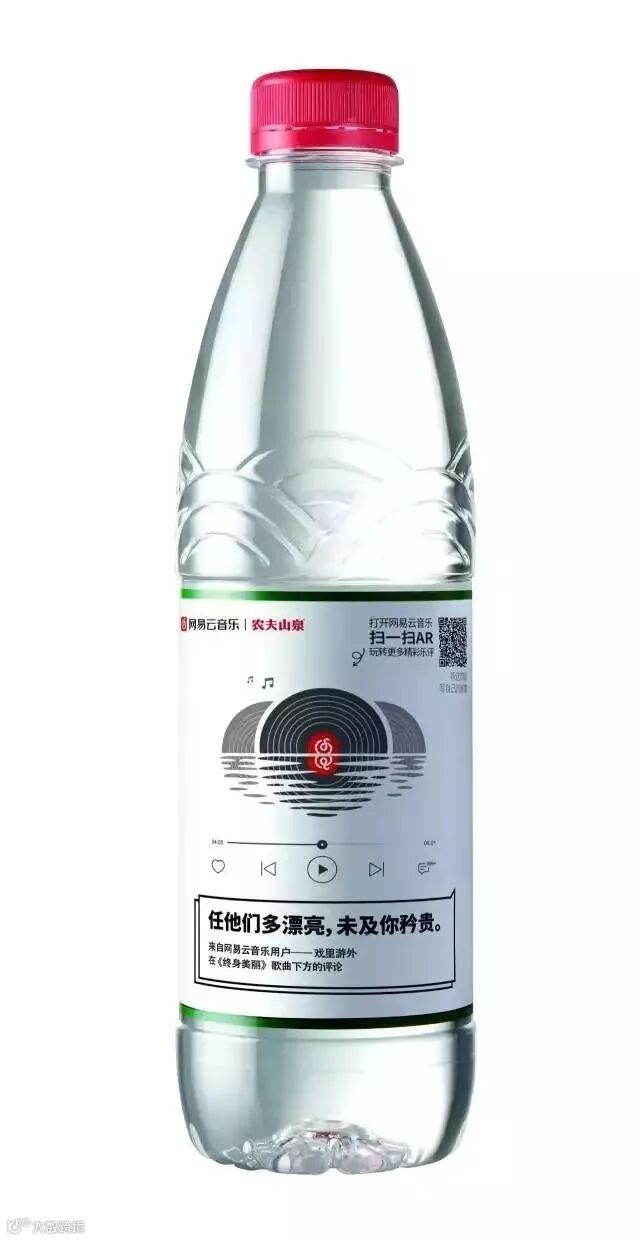 2017年,网易云音乐与农夫山泉展开跨界合作,精选30条用户乐评,印制了在4亿瓶农夫山泉饮用天然水瓶身上。这款瓶身用网易云音乐的黑胶唱片拼成农夫山泉的山水logo,再配上一句走心的评论,文艺范儿十足。