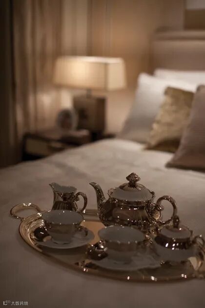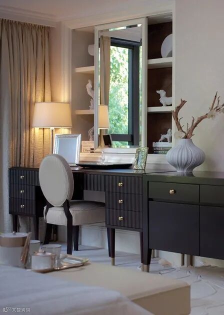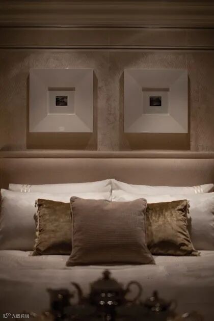 卧室,台灯简洁复古,床头背景墙使用纹理壁纸夸张的装饰画。浅卡其色床头,同色系床品,靠包错落摆放。使用华丽古典金色茶具。空间质感提升。梳妆台、书桌二合一功能区域。古典稳重。壁龛打造作为展架使用,摆件分布在镜子两侧。