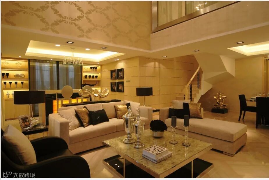 石金属包边茶几。灯具、摆件为金色反光质感。壁纸、窗帘材质相对是基础的基础的纹理颜色。地面石材颜色与大厅电视背景墙使用同色系浅色石材。