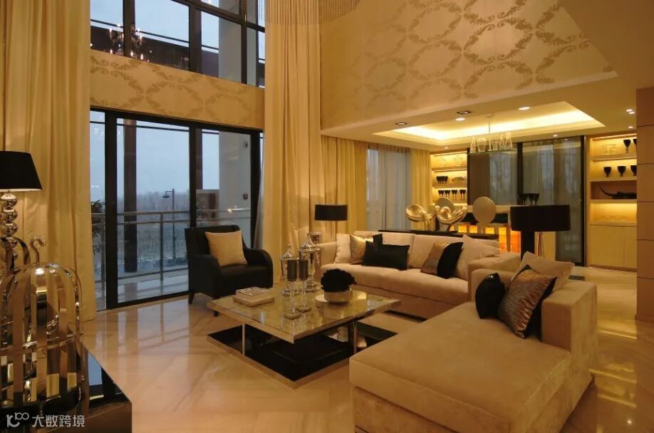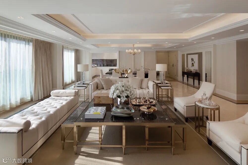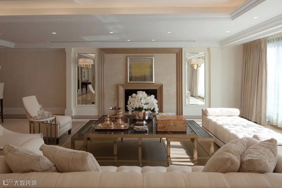 客厅区沙发使用典型新古典样式的简约沙发。茶几,一个不够那就一套组合茶几掰下来。大组合和小组合茶几都不放过。这样家具摆放富有层次。不会因为空间大,家具显得单薄。区域人多时,家具也是足够使用的。