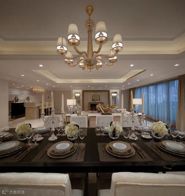 餐区,简洁的新古典餐桌椅。深色餐桌。米色绒布餐椅。基础款吊灯、华丽餐具。整个餐区氛围就很华丽了起来。