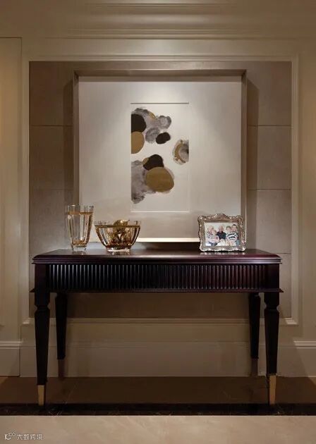玄关的一件条案家具,深木色,典型新古典风家具。配置华丽的水晶花瓶,玻璃器皿,相框,抽象装饰画。墙面基础硬装为白色使用简洁的欧式装饰线,局部硬包墙面做背景墙。