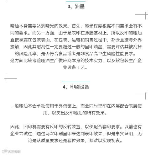局部哑光能极大地提升产品档次,正越来越广泛地应用在软包装上。要掌握好凹版印刷反印哑油技术,需要印前设计(版面设计)、原料选择以及生产各个环节,都需要充分评审,将风险水平降到最低可控的范围。