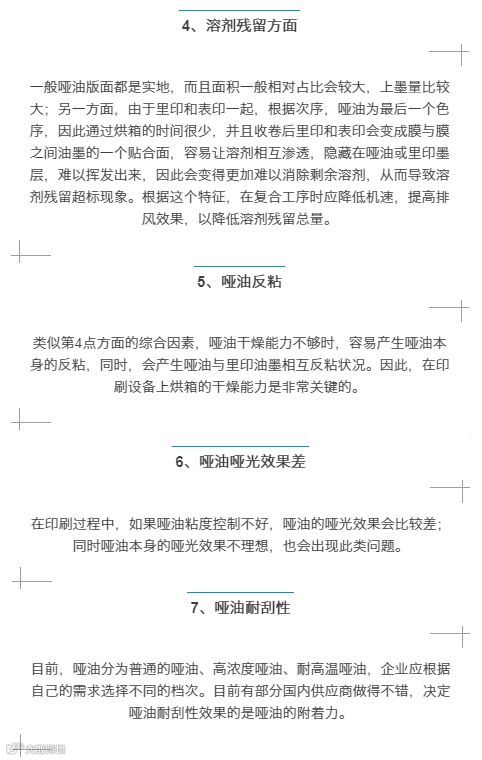 由于哑油要求做到耐刮性,其粘度相对是比较高的,另一方面,哑油的颗粒比一般里印油墨的颗粒会大得多,因此非常容易出现堵版,出现上不到哑油的现象,因此,在印刷调机过程中,开机时,应非常关注印版是否清洁干净,保证没有被堵塞的情况。