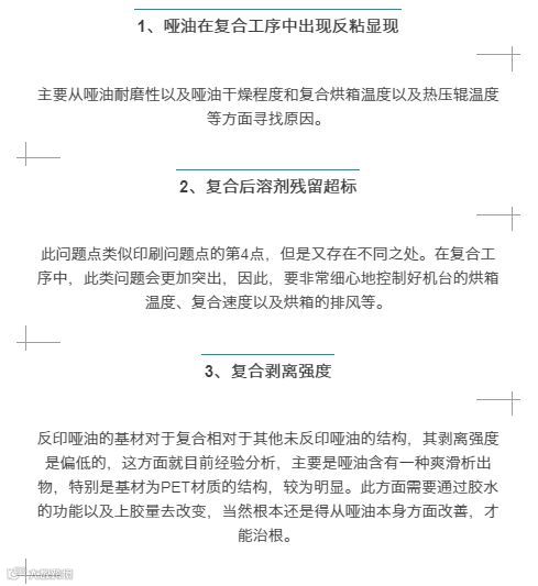 我们曾经用同结构材质进行过一组试验,除了哑油工艺变化外,其他胶水、印刷、制袋机台温度、压力等都是一致时进行比较,发现没有印哑油的袋子,没有出现拉链位置离层现象,而反印哑油的,会出现离层现象。基于此试验,哑油对于复合强度和制袋的耐温性是有一定影响的。