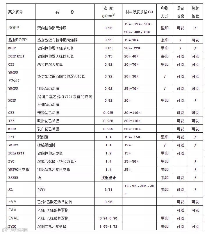 10、常用塑料软包装材料表