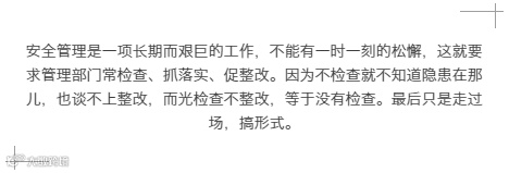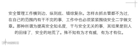 安全管理人员必须清醒地认识到,把安全工作搞好了,企业不出事故,职工不受伤害,就为企业创了效益,为职工赢得了幸福,这本身就是对管理人员的最大回报,而不能看别人的收益好,整天也想着怎样去创收,盘算自己的小九九,忙于自己的生意。自己的利益看得重了,安全的砝码就轻了。