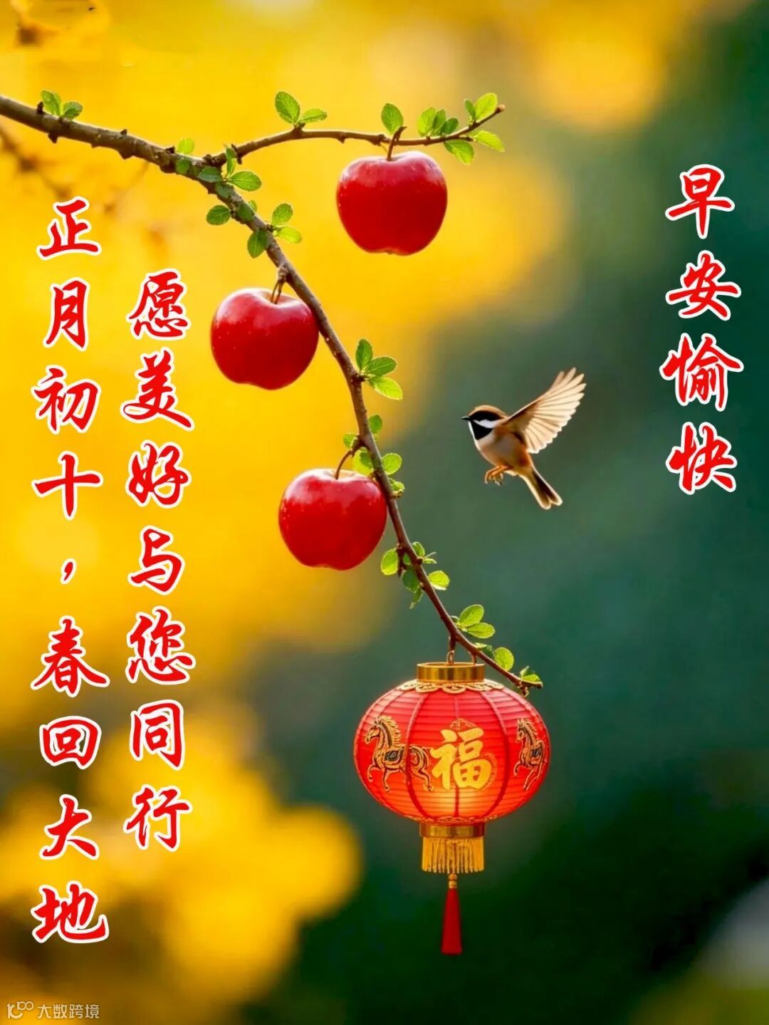 🌺春露凝香,送您满袖芬芳;春风送暖,赠您体魄安康;春晖遍洒,予您晨光万丈。正月初十,愿您:吉星高照好运到,四季如春乐逍遥!💐🌟
