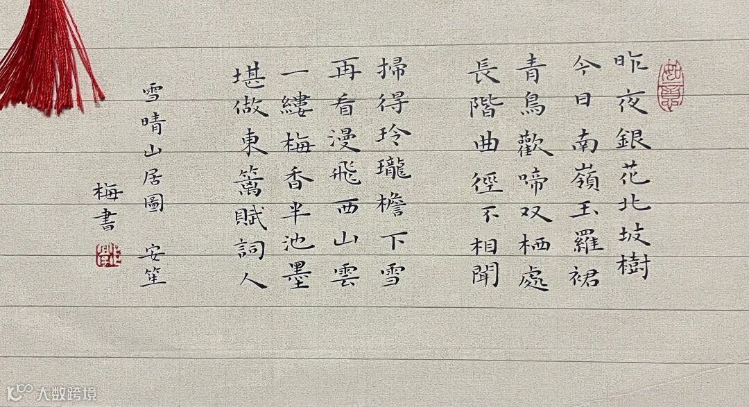 “昨夜银花北坡树” “今日南岭玉罗裙”,通过描绘北风席卷雪花,树枝上挂满冰晶的景象,展现了雪夜的壮美。远近结合,展现了雪后山川的辽阔与纯净。