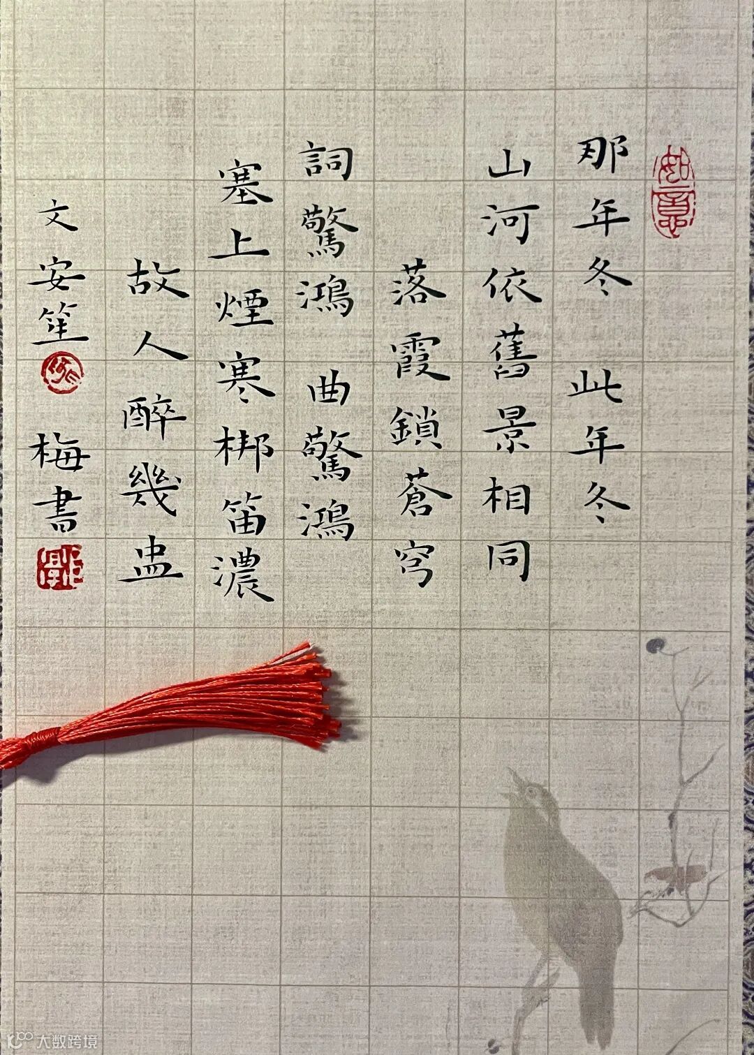 诗歌的下半部分,“词惊鸿,曲惊鸿”,以对仗形式,传达了诗人在词曲中寻觅故人踪迹的深情。“塞上烟寒梆笛浓”描绘出塞上冬日的苍凉氛围和笛声的悠远韵味。最后,“故人醉几盅”以问句作结,表达了诗人对故人相逢的渴望和在清酒中寻觅醉意、与孤鸿为伴的孤寂情怀,深化了长相思的主题。