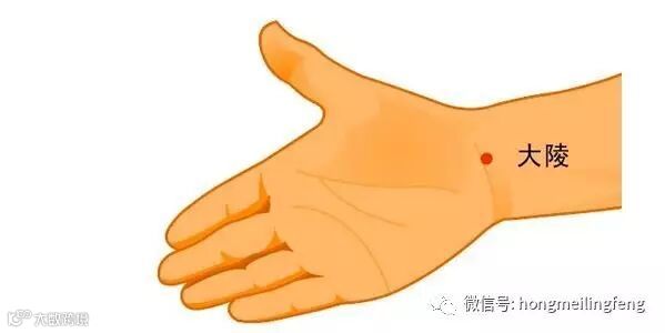 2.大陵穴:手心侧、手腕关节横纹筋正中点的凹陷处。手法:用拇指垂直按压大陵穴至感到酸痛,持续3~5秒,反复4~5次。
