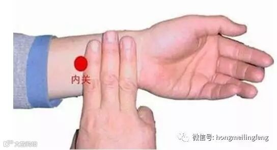 3.内关穴:从手腕中央向肘部移动三指,在两根筋中间的凹陷处。手法:用拇指用力按压穴位至感到明显酸胀,持续3~5秒,再充分揉1分钟。