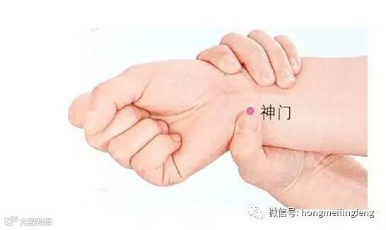 神门穴:在手掌侧的手腕上,偏向小指一端的凹陷处。两手各一。手法:用拇指指尖垂直按压穴位,每次3~5秒,直至产生睡意为止。