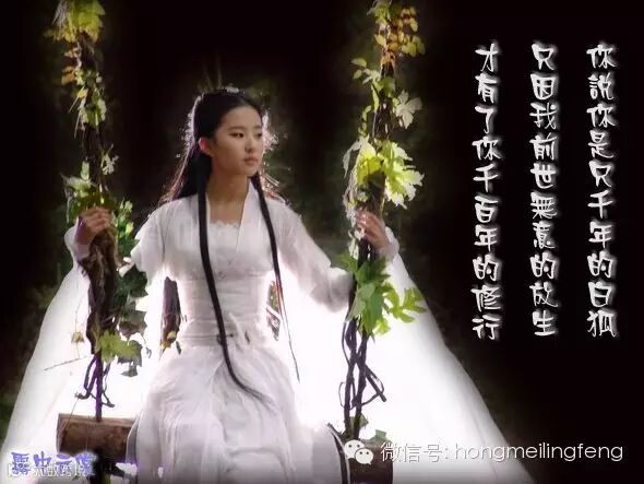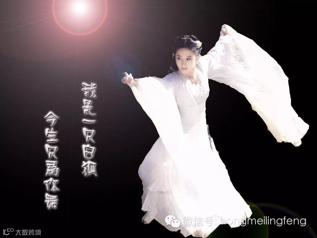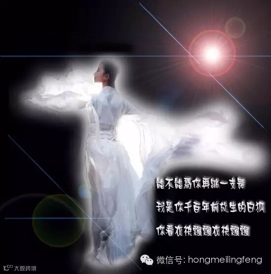 偶然的把目光投注在亭台小榭,被一缕优美的歌声所吸引。婀娜的身影,妩媚的笑颜,吸引了我的目光,也让我停足相望。在歌声里,你告诉我,你是一只修行了千年的白狐。只因千百前我无意的放生,才有了你千百年的修行。