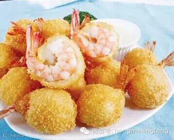 7)锅里放油,烧到六成热就把虾球放进去炸,不断地翻面,炸到外表金黄就可以捞出来了。