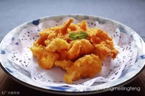 4)面粉加水和糊,捏住虾的尾巴把虾蘸好面糊,下油锅炸制,一手捏住虾的尾巴,一手用锅铲往虾身上撩油。炸好后把虾摆盘