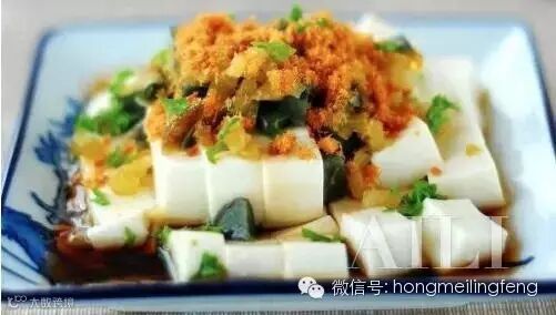 原料:内脂豆腐1块、鹌鹑皮蛋3只、榨菜15克、肉松1大匙、芝麻香油2滴、生抽1小匙、欧芹少许。