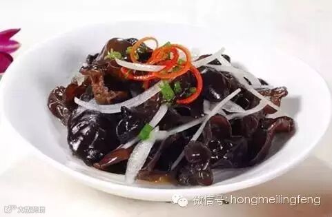 3)、汤锅中水开后,下黑木耳焯至水再开即可捞出,过凉水后备用。根据个人喜好可将胡萝卜也焯一下;