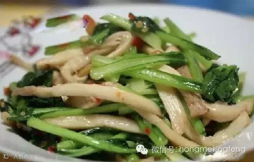锅里放油,下葱姜蒜和剁椒炒香,下青菜和蘑菇进去,大火炒几下,淋料酒,放盐,鸡精,白糖少许,胡椒粉,炒几下就可以了。