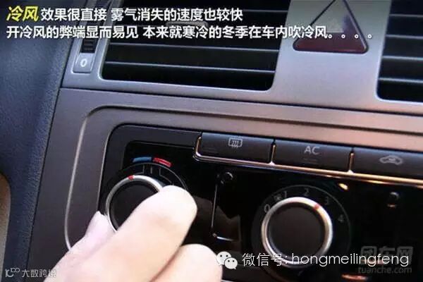 为前风挡除雾开冷风是最快的,而弊端就是在冬季使用。日常我们除雾都认为是开启按下车内前风挡除雾键,不过这种方法比较慢,如果有大面积的起雾,最好使用冷空调吹玻璃模式解决,这样去除湿热空间的见效快。