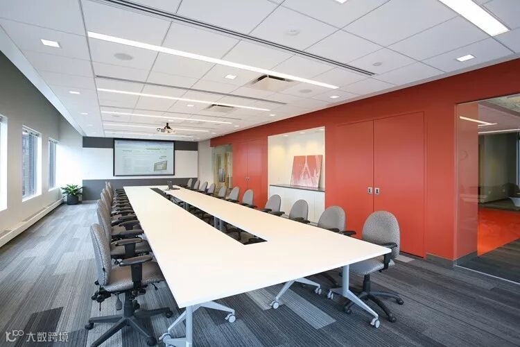 大会议室使用的是轻型的可移动的培训条桌。会议椅也是轻型的常规职员网椅会议室一面墙做了大型储物柜,并且使用了橘红色来装饰这面墙和柜体。局部开放做装饰画展示。整个大会议室空间不憋闷,较为轻快。