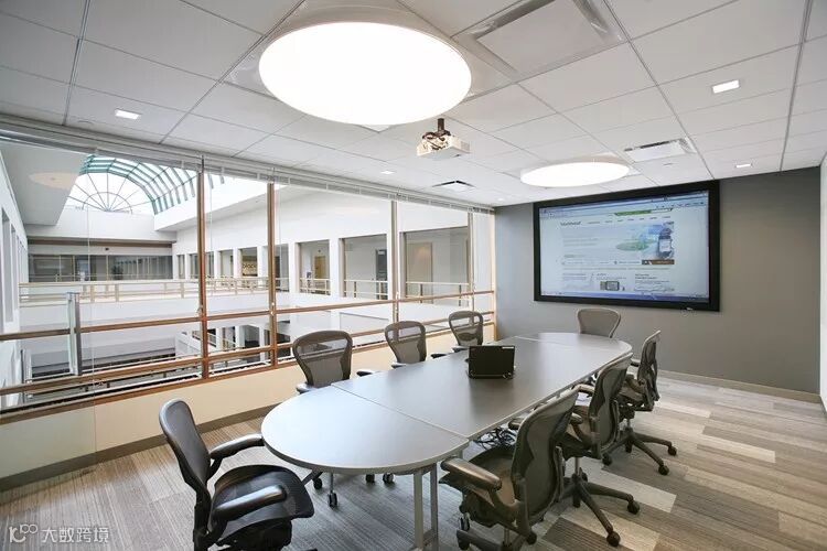 小会议室设计则采用了灰色椭圆会议桌的设计,灰色墙面,整个空间简约干练,十足商务气。椭圆与原型吸顶灯造型呼应。空间内有了律动感。
