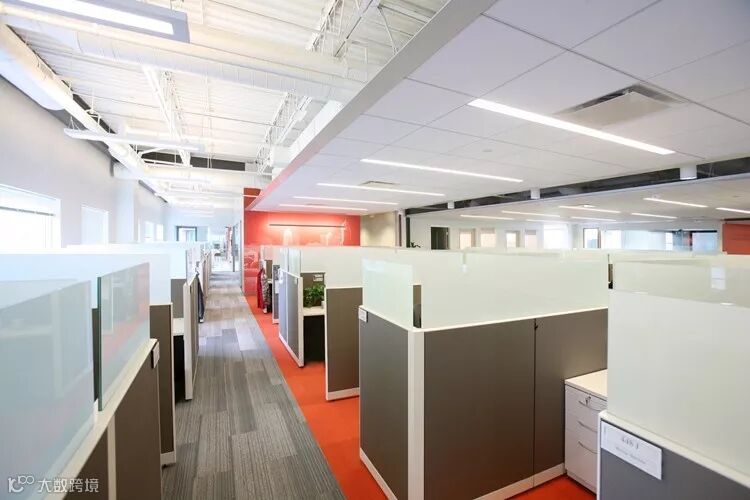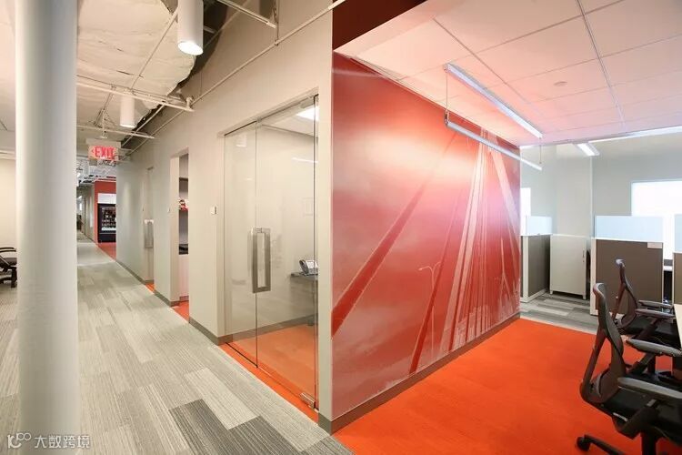 灰色屏风工位,使用了磨砂玻璃做搭配。大空间的设计差异使用了地毯灰色橘色拼接,橘色地毯尽头,颜色延伸到墙面,空间也有了节奏感。