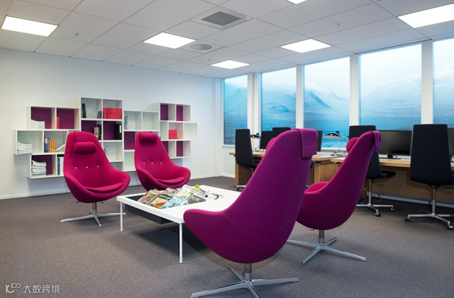 另一个办公空间内的书架角落。白色和玫红色盒子固定在墙面的设计,配色上与该区域的座椅强烈呼应。