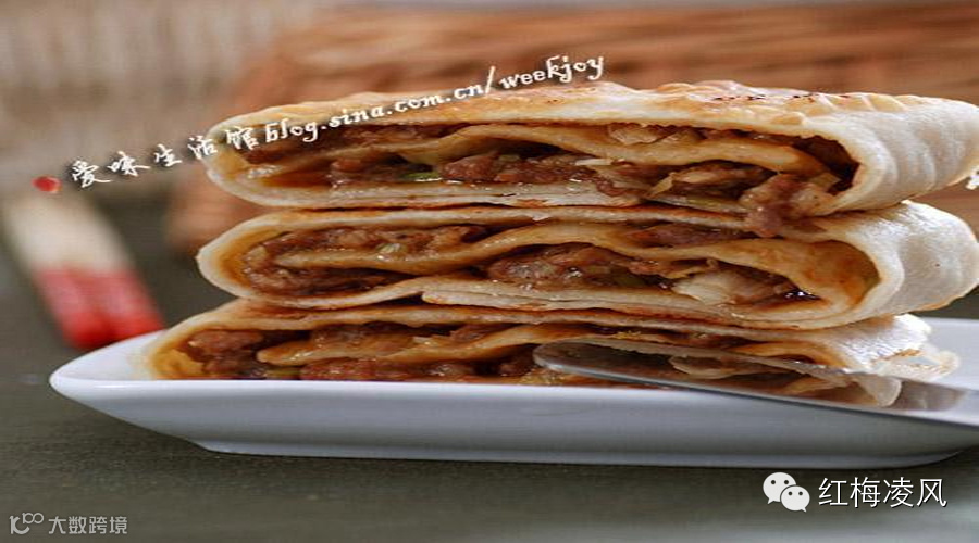 2.面皮擀成一张大薄饼,分成四块,一块留空,其余的铺上肉馅儿,一层一层对折,把馅儿盖住,最后成一个扇形,封口。