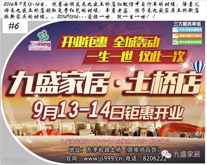 九盛家居.土桥新店新增三万平专业家具卖场,新进60大一线家具品牌。9月13-14日盛妆开业:开业巨惠,全城轰动,一生一世,仅此一次。东茅岭路友谊市场对面(原崇尚百货)。8206222。