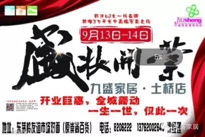 九盛家居.土桥新店新增三万平专业家具卖场,新进60大一线家具品牌。8月22日试营业,9月13-14日盛妆开业:开业巨惠,全城轰动,一生一世,仅此一次。东茅岭路友谊市场对面(原崇尚百货)。8206222。