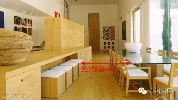 餐桌椅预留空间:一套餐桌可能会已经占据餐厅的大部分空间,所以在挑选前需要留意,到底留多少距离才能方便使用,因为餐椅坐面至少45x45cm,所以餐桌和餐椅拉开后要预留50cm以上的空间,人才能方便坐下用餐。