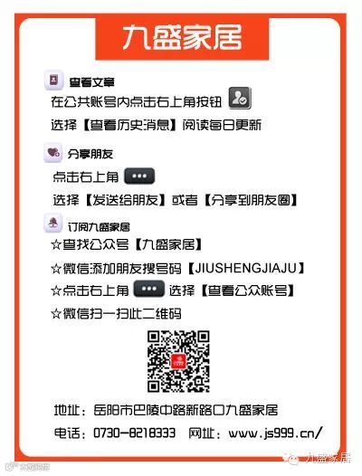 如果您还没有关注我,请点击图片上面日期右边【九盛家居】再点击“关注”,就可关注我!我们每天将会与您分享世界上最精华最精彩的资讯!
