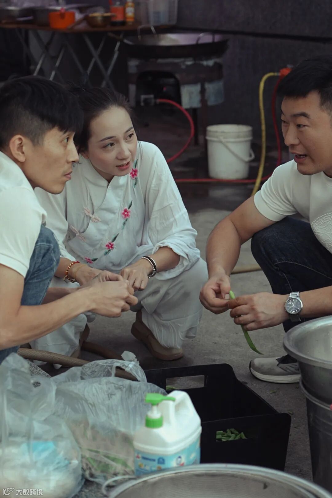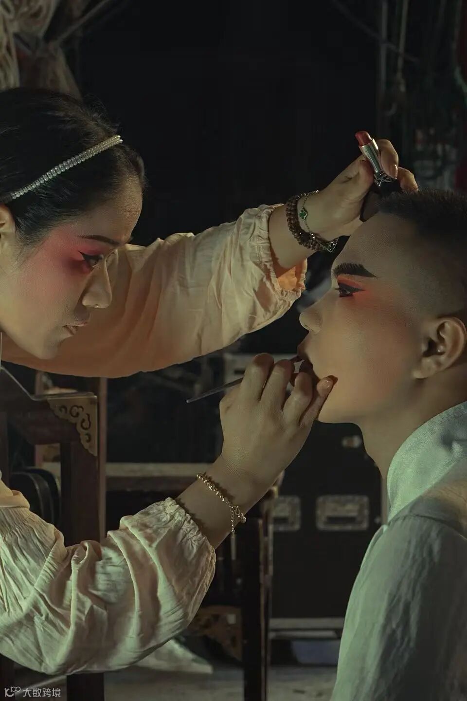 有的人一边择菜一边聊家常;也有人在旁边聊着某出戏里的人物历史,推敲台词;阿林在角落里刷着戏曲短视频,跟着唱调摇头晃脑。饭后,大家开始在戏台旁架起各自的道具箱,开始换装、化妆。阿林招呼我们在一旁饮茶,茶桌是一个倒扣着的烧融出数排孔洞的塑料桶,洗茶的水一浇就流了下去,十分方便。