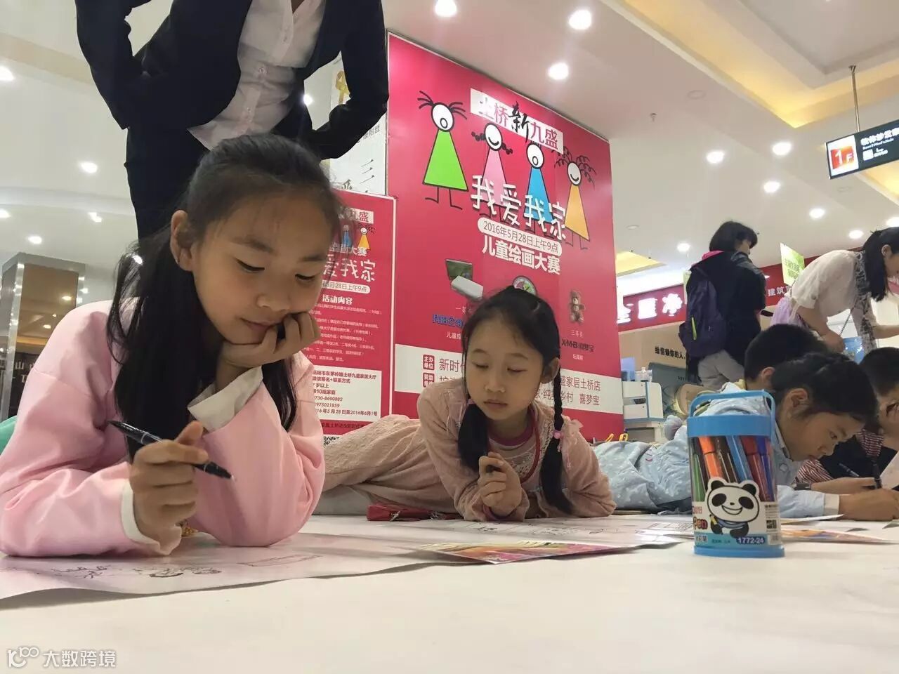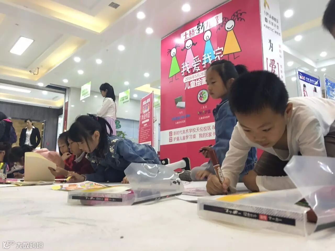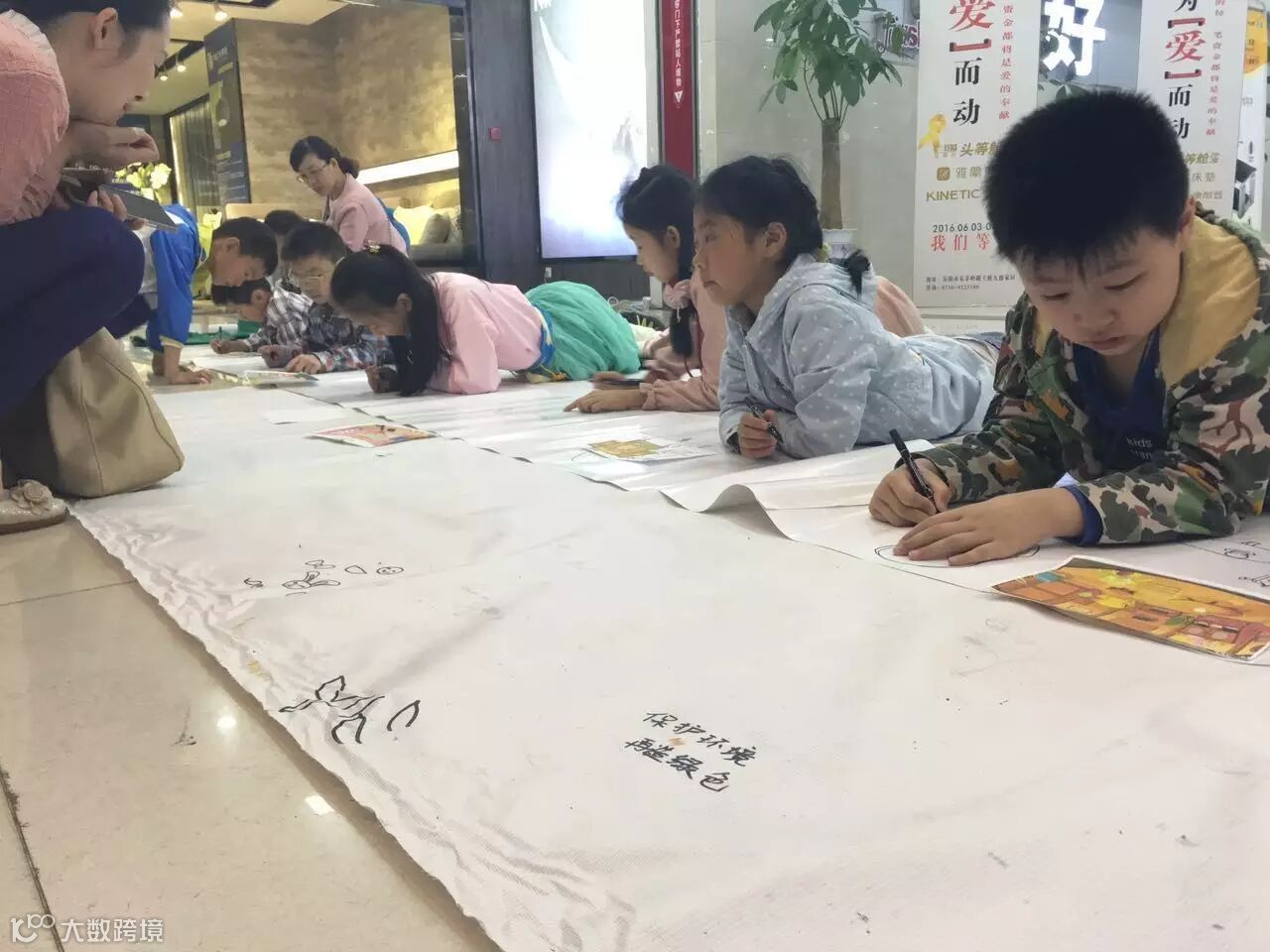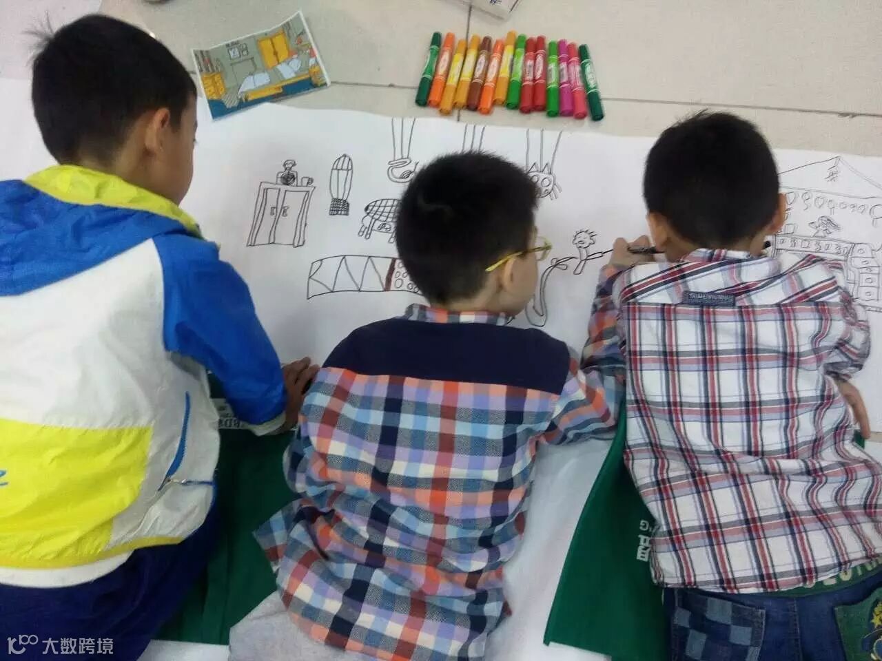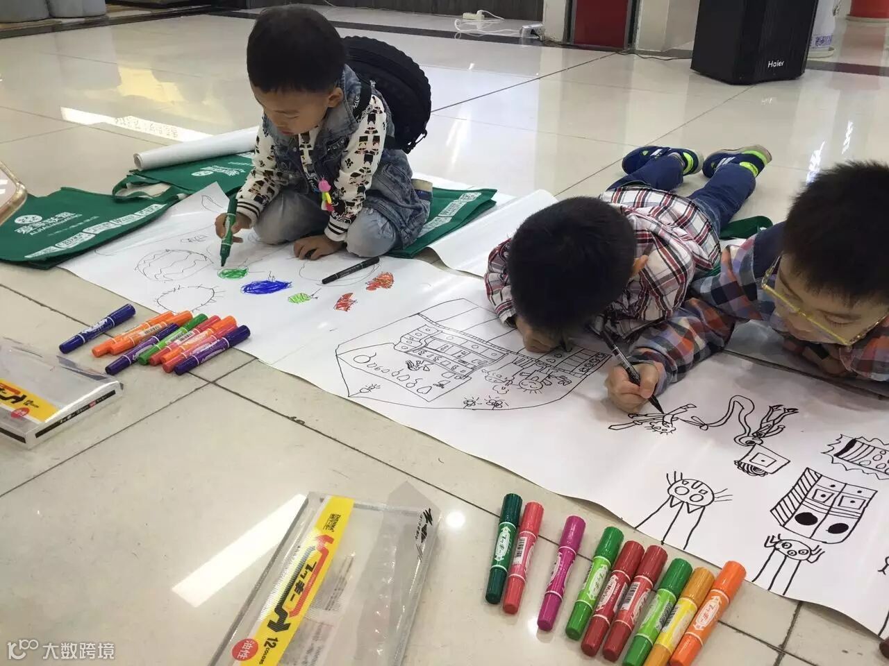 [ 各位小画家,各种姿势趴在地上大笔一挥,开始作画。]