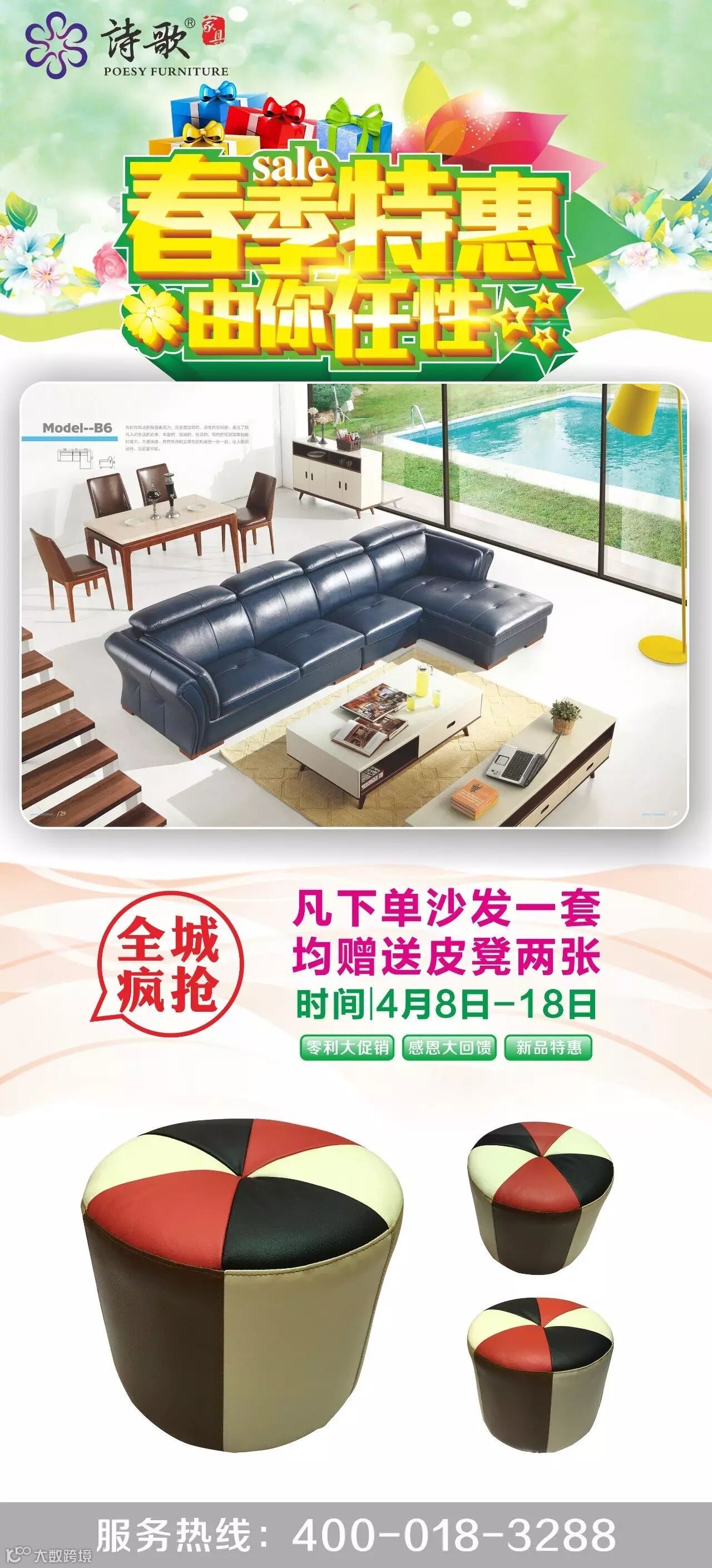 导读:凡于4月8日-18日订购沙发一套,即送皮凳两张,无休止赠送~~