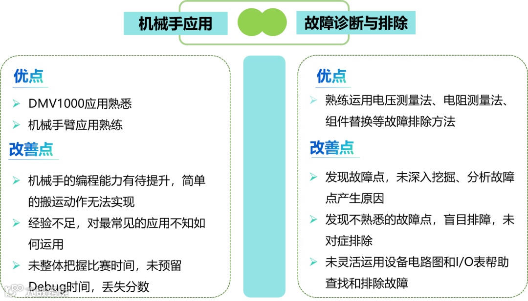 机械手故障诊断与排除赛考察队员之间分工协作,快速排除配电箱线路故障、I/O信号故障、通讯故障等能力,选手根据安全操作规范去排障,快准精是故障排除的必胜法宝。一组六轴机械手选手技艺精湛,在比赛时间紧张下,闪电般地找出了七大故障!