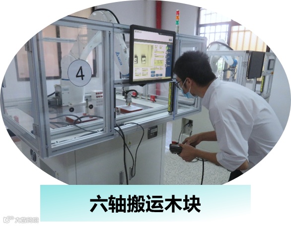 机械手应用赛考验选手程序逻辑设计、智能设备校点、指令发送等能力,考察木块搬运、像素与位移比计算、纠偏计算等内容,两人分工合作,一人进行程序编写,一人负责校点,两人默契配合,以最快最精的速度完成任务。