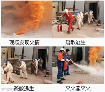 下午18:30应急演练在现场指挥梁明有序组织下正式开始。现场员工发现面漆烘房起火,立即报告给班组班长,接到报告后,立即组织员工疏散逃生,并组织班组成员使用灭火器进行灭火。