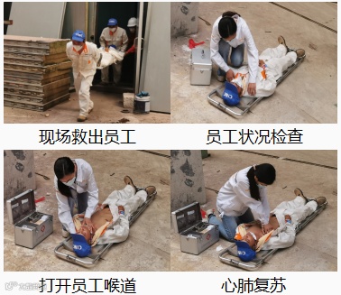 疏散过程中发现少一名员工,现场指挥立即组织义务消防队开展救援工作,救出员工后,由公司医务室人员检查时发现已休克。立即进行心肺复苏和人工呼吸,同时报120。