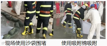 现场消防水冲刷油漆,导致部分油漆混合消防水,可能造成环境污染,义务消防队现场使用消防沙进行围堵,并使用吸附棉进行吸附处理。