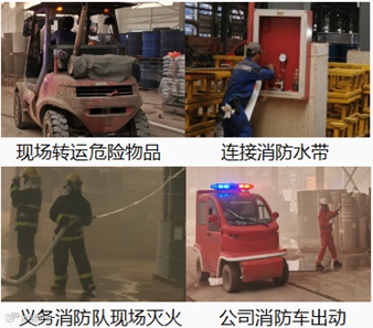火势失控,现场班组已无法处置,上报到部门负责人和现场指挥,接到报告后,立即启动公司火灾爆炸事故专项应急预案。组织现场转移危险物品,通知公司义务消防队进行灭火,火势顺利控制并扑灭。