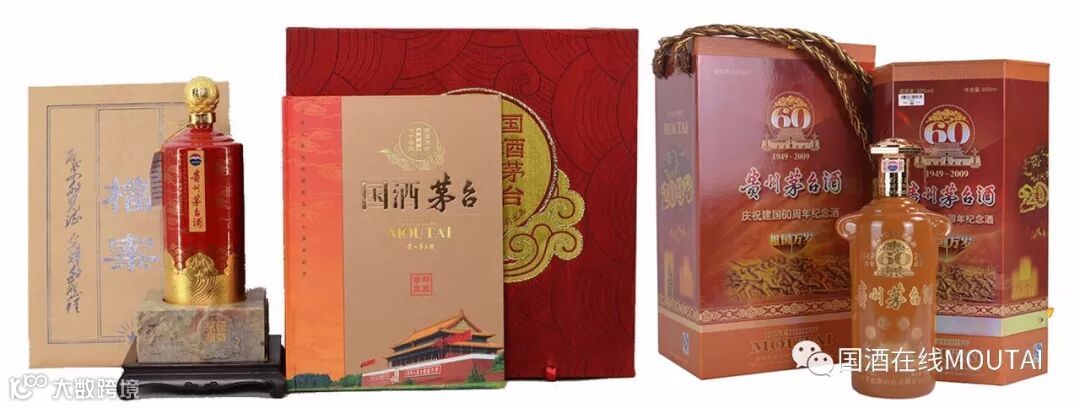 茅台为庆祝建国60周年特生产的纪念酒“开国盛世大典”、“建国六十周年”均为600ml,另有一款市面几乎无迹可寻的“黄永玉90寿辰”600ml装纪念酒。