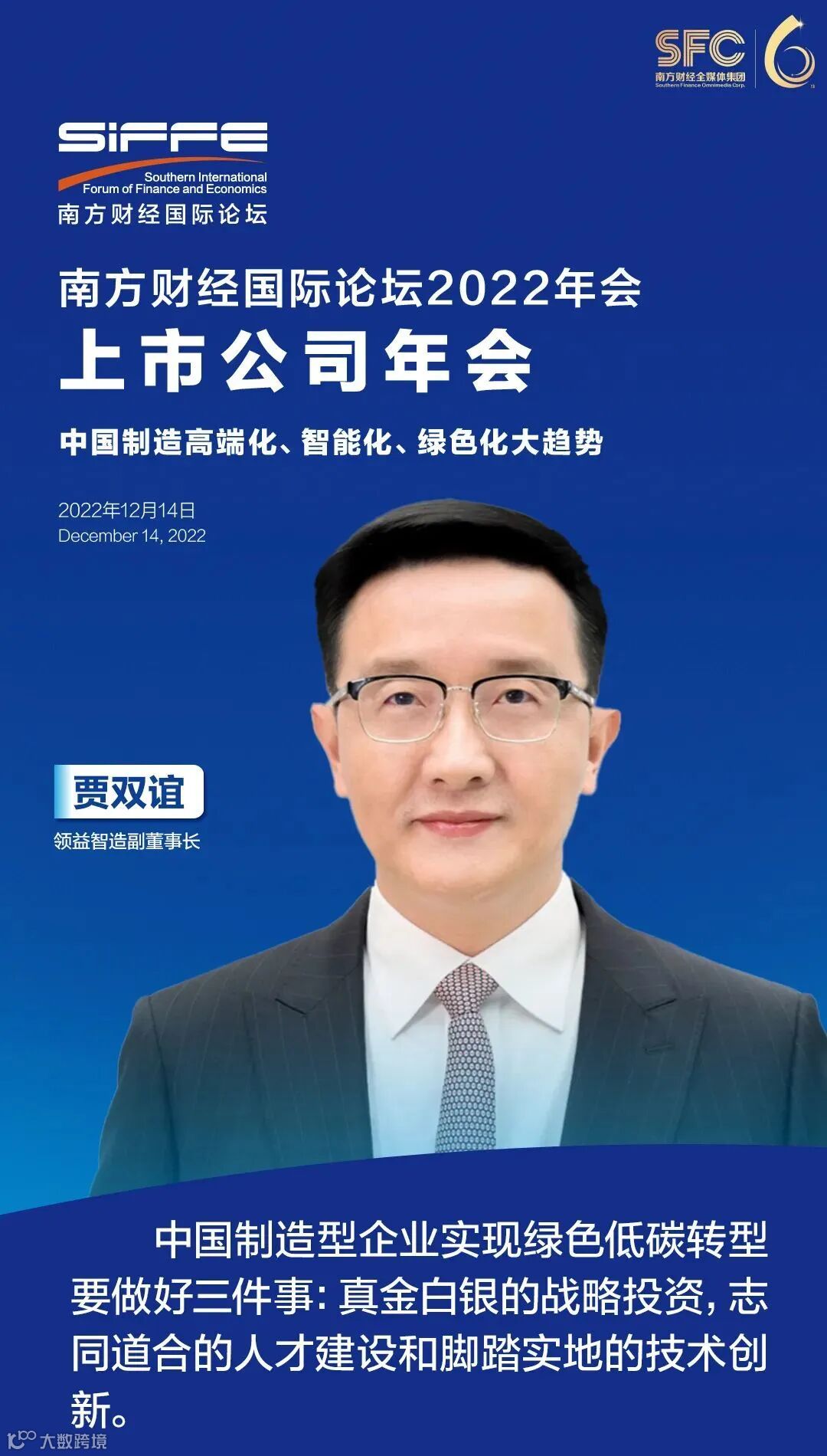 12月14日下午,由南方财经全媒体集团主办,21世纪经济报道承办的“南方财经国际论坛2022年中国上市公司年会”以线上直播的方式举行。本届上市公司年会以“中国制造高端化、智能化、绿色化趋势”为主题。