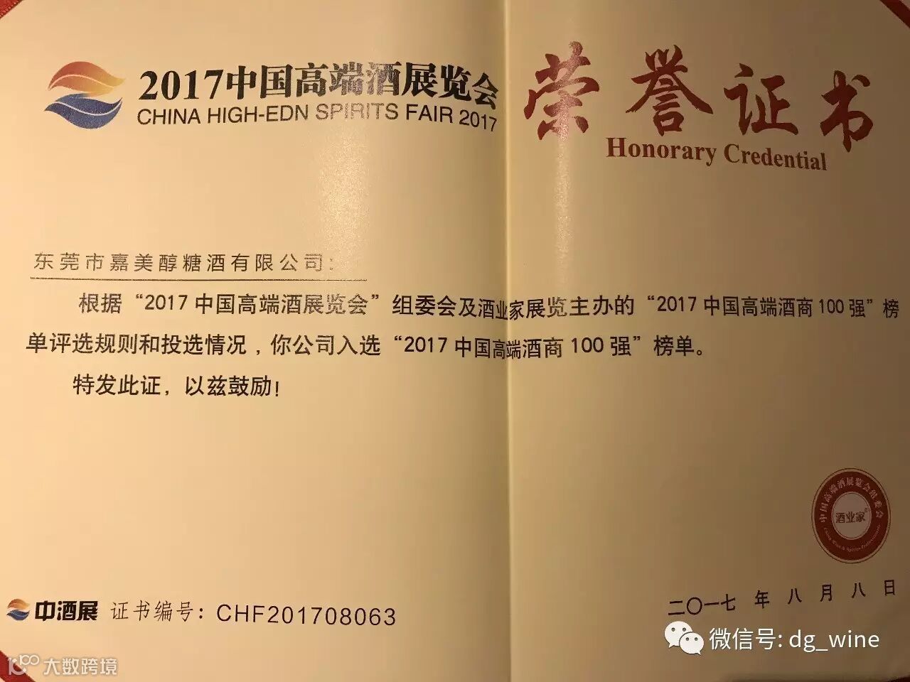 经过多项激烈的比拼,“东莞市嘉美醇糖酒有限公司”终获中国高端酒展览会组委会授予的『2017中国高端酒经销商100强』荣誉称号,肯定了东莞市嘉美醇糖酒有限公司经营国内知名白酒及进口葡萄酒取得的成果!