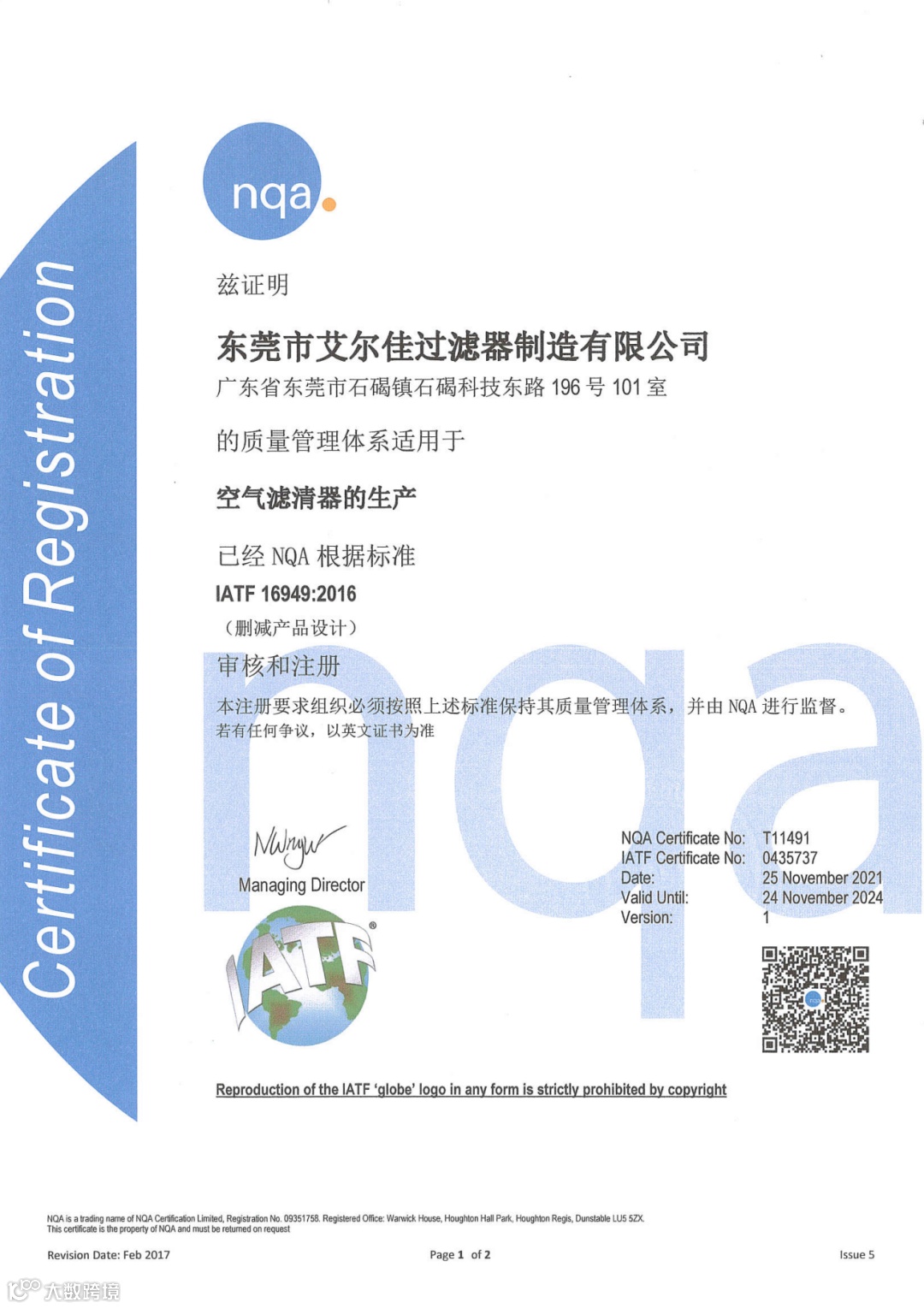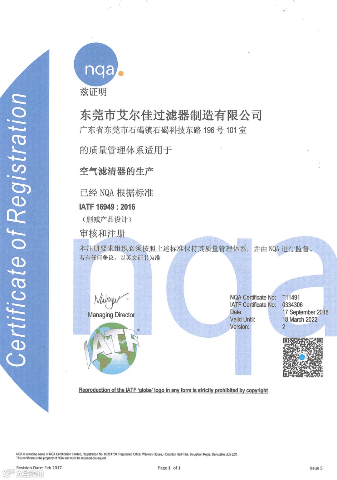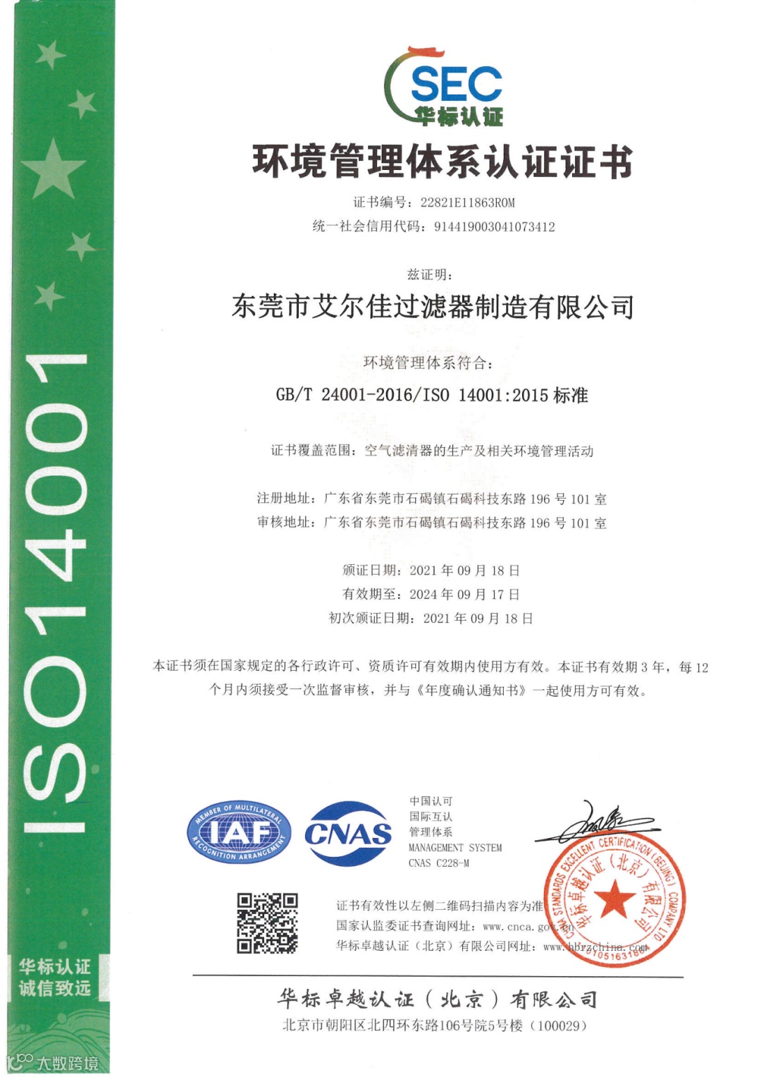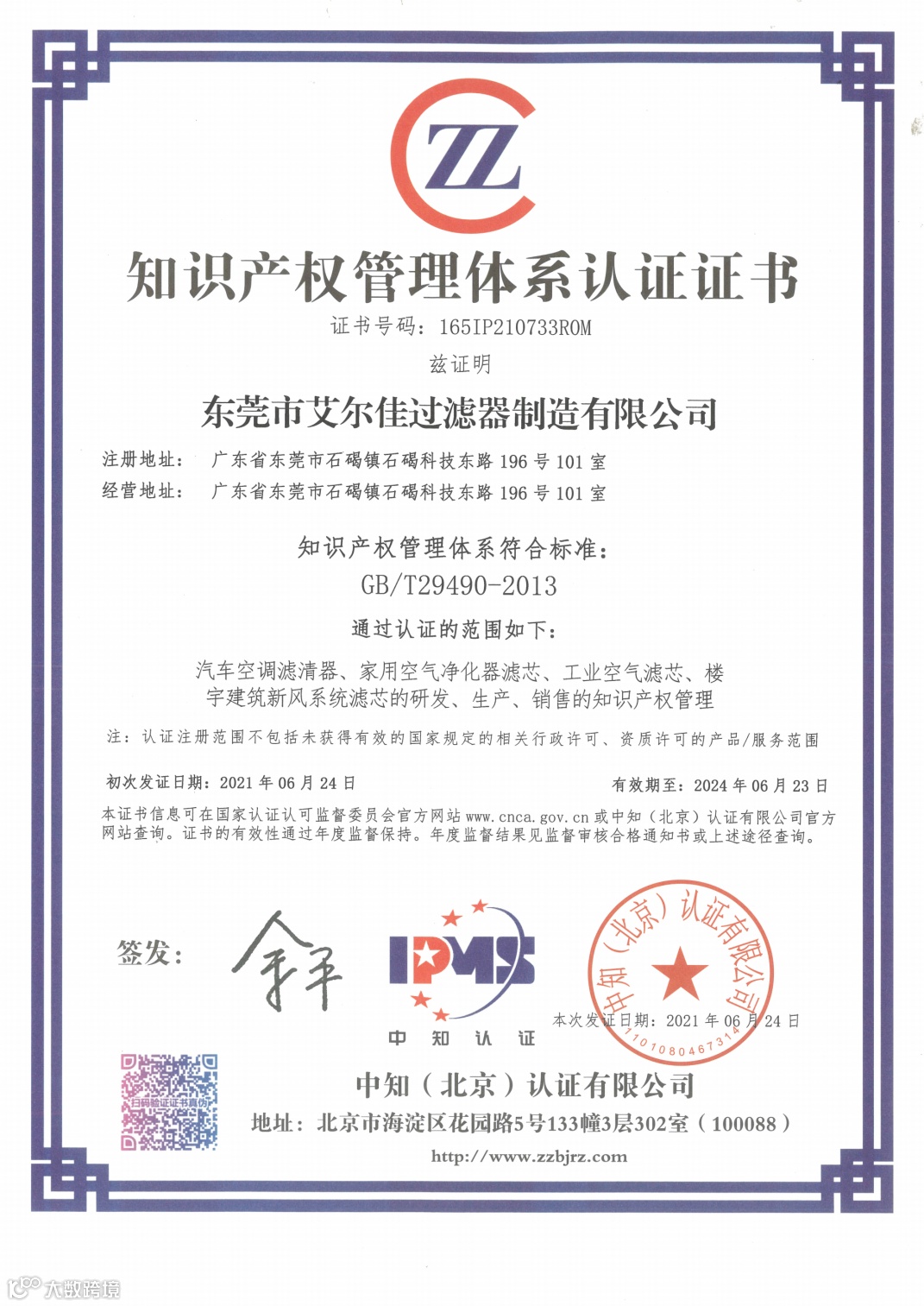艾尔佳公司在2016年9月获得ITAF16949质量体系认证,2021年9月获得环境质量体系认证ISO 14001:2015,2021年6月获得知识产权管理体系认证 GB/T29490-2013,可提供日常-车用-工业一系列场景空净解决方案。