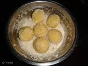把沾有蛋液的南瓜球,放入面包糠碗里裹满面包糠。