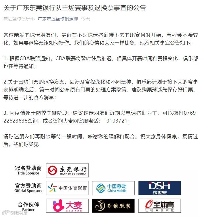 为全力做好新冠肺炎防控工作,避免人员聚集引发交叉感染,保障人民群众健康安全,东莞银行篮球中心自2020年2月3日起已关闭所有出入口,具体恢复正常运营时间将视疫情发展及相关部门部署另行通知。