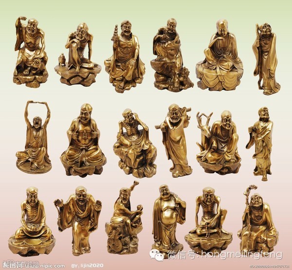 【十八罗汉】布袋罗汉、长眉罗汉、芭蕉罗汉、沉思罗汉、伏虎罗汉、过江罗汉、欢喜罗汉、降龙罗汉、静坐罗汉、举钵罗汉、开心罗汉、看门罗汉、骑象罗汉、探手罗汉、托塔罗汉、挖耳罗汉、笑狮罗汉、坐鹿罗汉